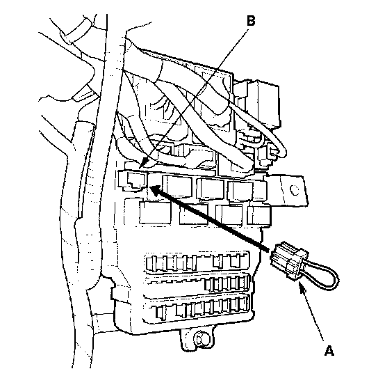 4. Connect the MFCS Service connector (A) to the MCIC socket (B) in the under-dash fuse/relay box.