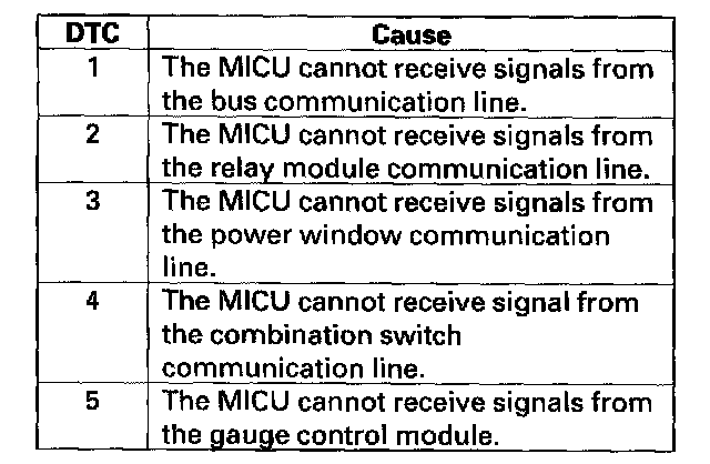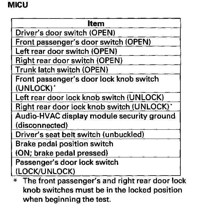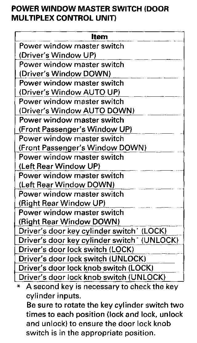 - DTC 3 only (no other DTCs present): Go to the door multiplex control unit input test. If all inputs are OK, substitute a known-good door multiplex control unit and then a MICU, one at a time, and then check for DTCs. If a DTC recurs after a substitution, replace that unit.