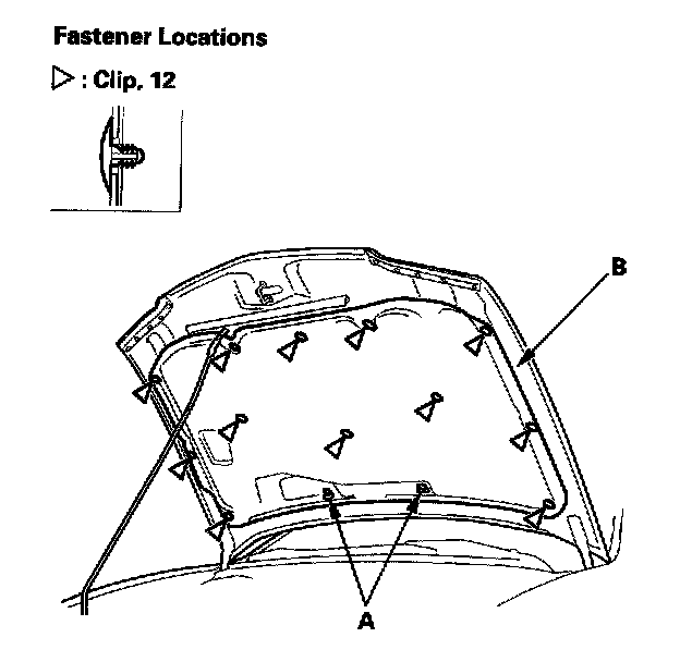 1. Using a clip remover, detach the clips. Release the hooks (A), then remove the hood insulator (B). Take care not to scratch the hood.
