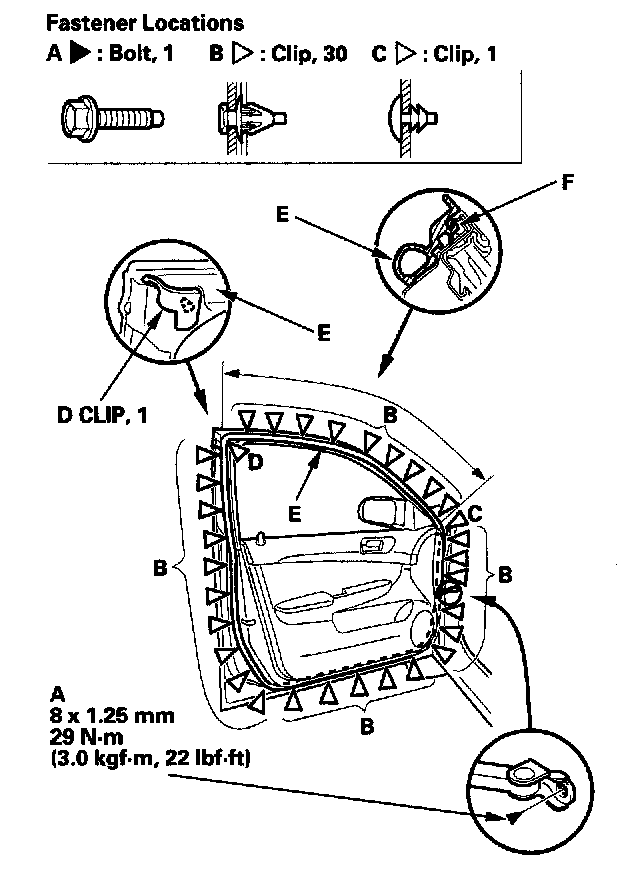 2. Detach the clips (B, C, D), then remove the door weatherstrip (E).