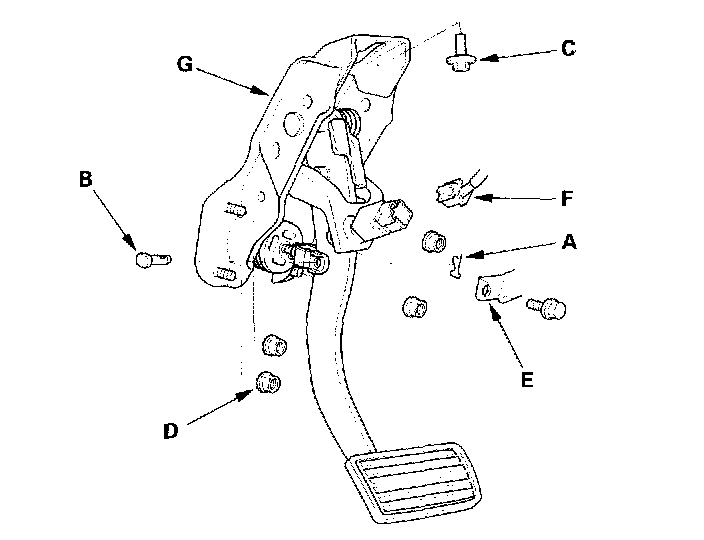 2. Remove the brake pedal bracket mounting bolt (C) and nuts (D).