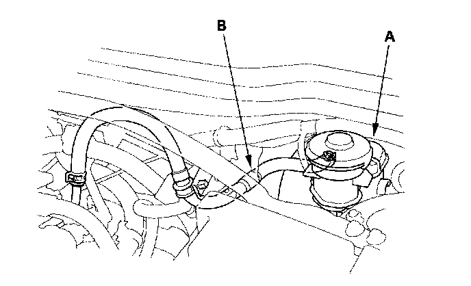 3. Disconnect the brake booster vacuum hose at the booster (A). The check valve (B) is built into the hose.