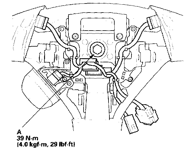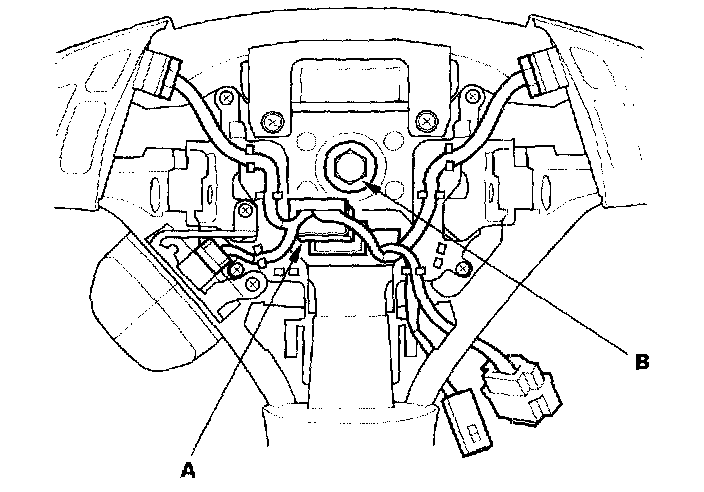 4. Disconnect the connector (A) from the cable reel, then remove the steering wheel bolt (B)