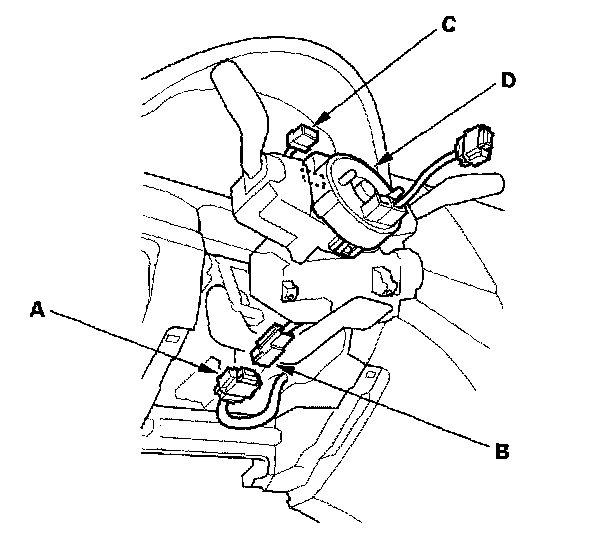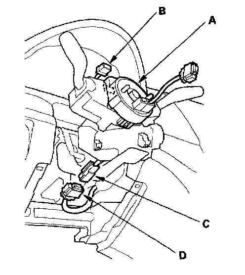 8. Disconnect the dashboard wire harness 4P connector (A) from the cable reel 4P connector (B), then disconnect the dashboard wire harness 13P connector (C) from the cable reel (D).